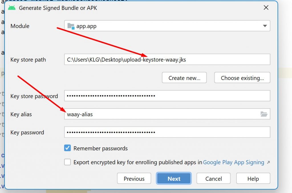 Selecionar a opção bundle, escolher o caminho para a key e escrever a key alis e passwords da app conforme a imagem abaixo: